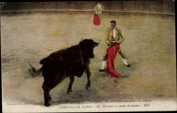 Ak Bullfight, Matador-Stierkampf mit einer Krücke
