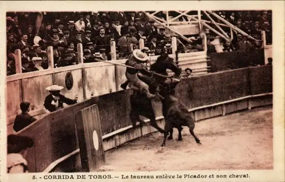 Ak Bullfight, The taureau enlevé the Picador et son cheval