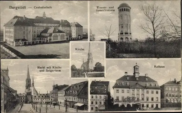 Ak Burgstädt in Sachsen, Centralschule, Wasser und Aussichtsturm, Rathaus. Kirche