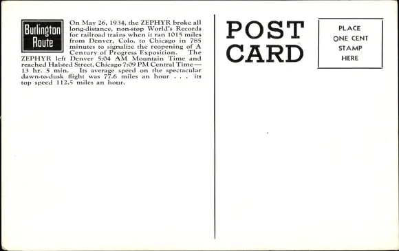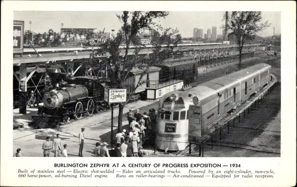 Ak Burlington Zephyr auf der Ausstellung „A Century of Progress“ 1934