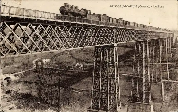 Ak Busseau d'Ahun Creuse, Eisenbahnbrücke, Zug