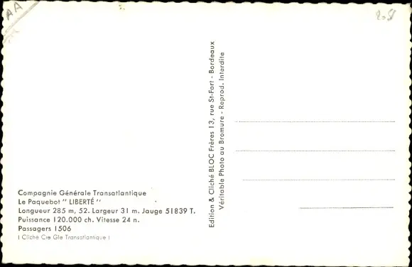 Ak CGT French Line, Dampfschiff Liberte, Paquebot