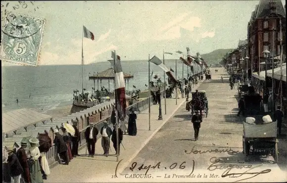 Ak Cabourg Calvados, la Promenade de la Mer, Spaziergänger, Pferdekutschen