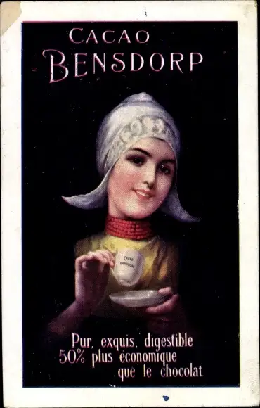 Ak Cacao Bensdorp, Frau in Tracht mit Tasse und Unterteller, Reklame