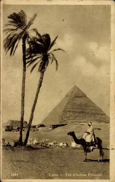 Ak Cairo Kairo Ägypten, Beduine auf Kamel, Pyramide, Palmen