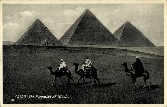 Ak Cairo Kairo Ägypten, Kamelreiter bei den Pyramiden von Gizeh