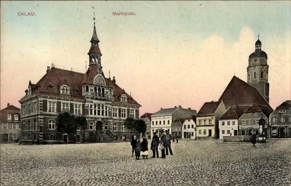Ak Calau in der Niederlausitz, Marktplatz, Rathaus, Kirche, Litfaßsäule