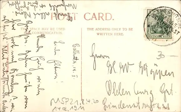 Zustand, siehe Scan, gelaufen- Stempel Marinepost MSP Nr. 21.8.4.20, Kleiner Kreuzer Leipzig, 14.02.1911 - ca 14 cm X 9 cm