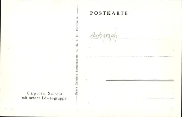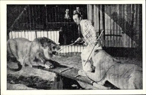 Ak Capitän Smola mit seiner Löwengruppe, Zirkus, Dompteur, Raubtierkäfig, Autogramm