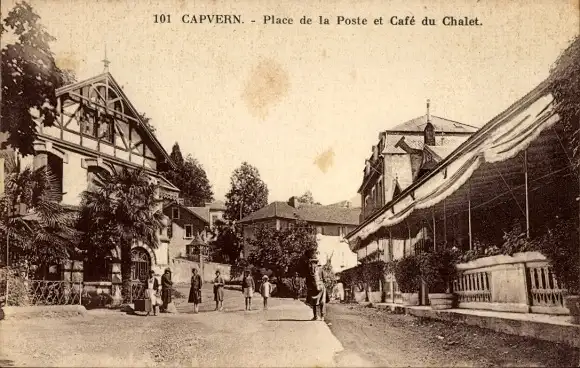 Ak Capvern Hautes Pyrénées, Place de la Poste und Café du Chalet