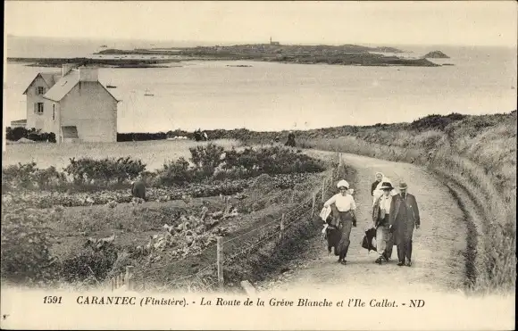 Ak Carantec Finistère, die Route de la Greve Blanche und Ile Callot