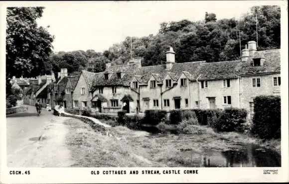 Ak Castle Combe Wiltshire England, alte Cottages und Stream