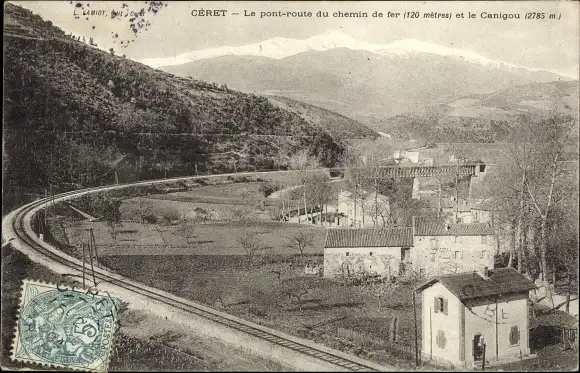 Ak Ceret Pyrénées Orientales, Le pont route du chemin de fer et le Canigou