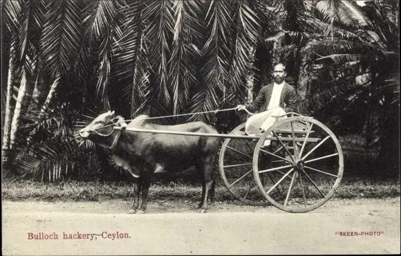Ak Ceylon, Bullock hackery, Zebu zieht Karren, Palmen