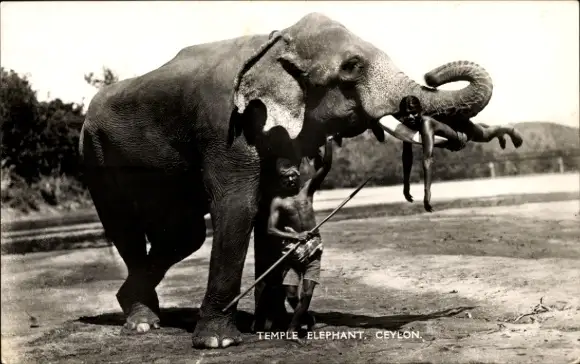 Ak Ceylon Sri Lanka, Elefant mit Mahut, Mann liegt auf einem Stoßzahn