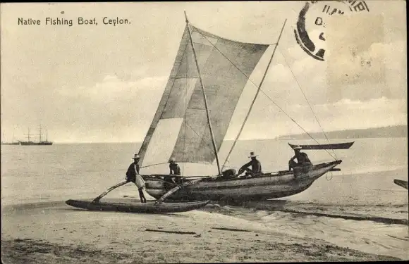 Ak Ceylon Sri Lanka, Native Fishing Boat, Boot am Strand, Fischer, Segel