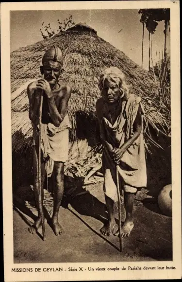 Ak Ceylon Sri Lanka, Un vieux couple de Pariahs devant leur hutte