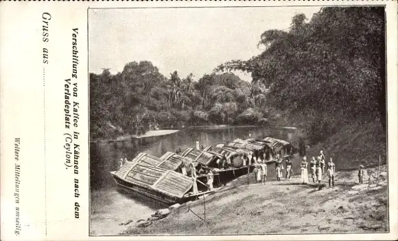 Ak Ceylon Sri Lanka, Verschiffung von Kaffee in Kähnen nach dem Verladeplatz
