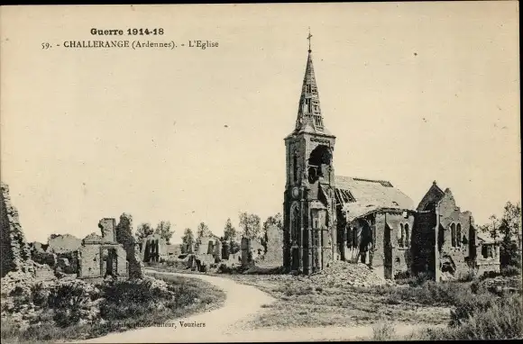 Ak Challerange Ardennes, Vue de l'Eglise, Ruines