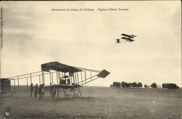 Ak Châlons Camp Mourmelon Camp Marne, Flugplatz, Henry Farman Doppeldecker