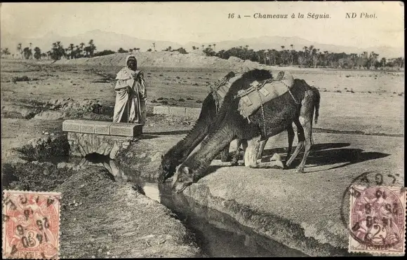 Ak Chameaux a la Seguia, Maghreb, Kamele trinken Wasser