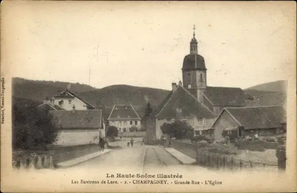 Ak Champagney Haute Saône, Grande Rue, L'Eglise