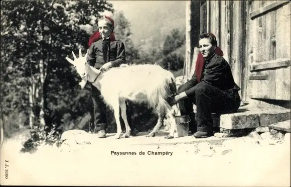Ak Champéry Kt. Wallis, Paysannes, Zwei Bäuerinnen in Trachten, Ziege