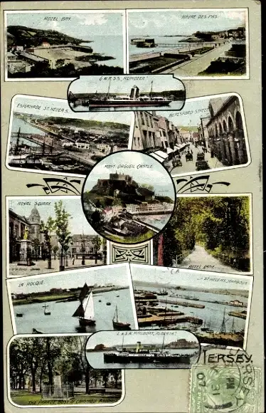 Ak Channel Island Jersey, Mont Orgueil Castle, Royal Square, Hafen, Straßenansicht