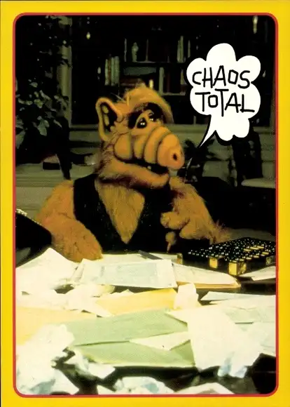 Ak Chaos total, Alf, Tisch mit Papieren