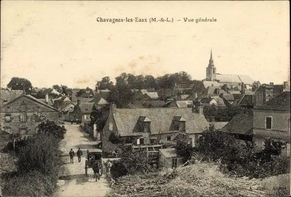 Ak Chavagnes les Eaux Maine et Loire, vue générale, eglise, charrette à cheval