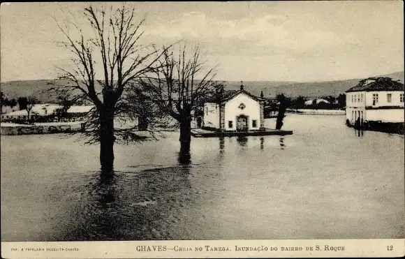 Ak Chaves Portugal, überflutete Straßen, Häuser