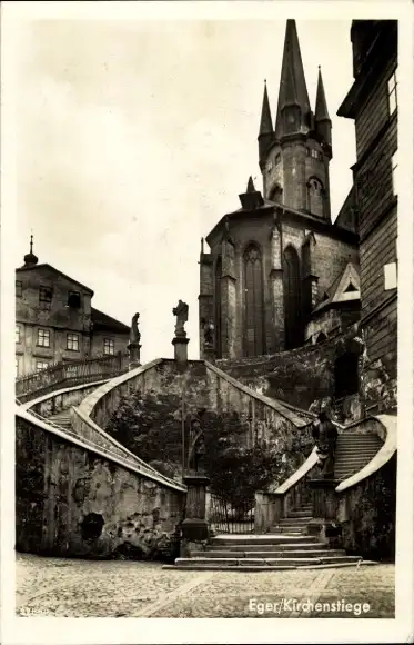 Ak Cheb Eger Reg. Karlsbad, Kirchenstiege, Freitreppe, Turm