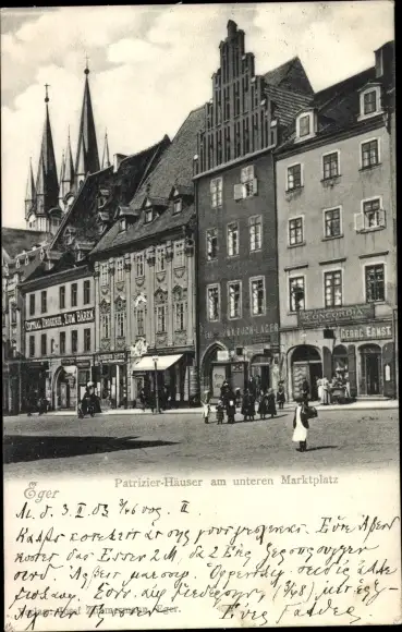 Ak Cheb Eger Reg. Karlsbad, Patritzier-Häuser, Unterer Marktplatz