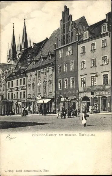 Ak Cheb Eger Reg. Karlsbad, Patritzier-Häuser am unteren Marktplatz