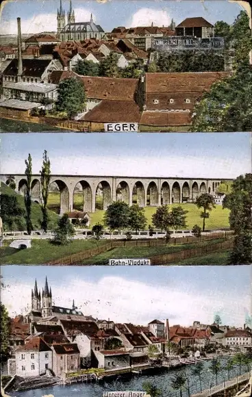 Ak Cheb Eger Region Karlsbad, Panorama, Bahnviadukt, Unterer Anger