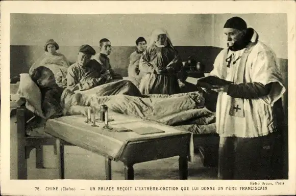 Ak Chefoo Yantai China, Un malade recoit l'extreme onction, Pere franciscain, Franziskaner, Kranker