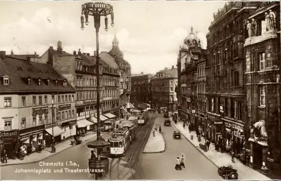 Ak Chemnitz in Sachsen, Johannisplatz, Theaterstraße, Geschäfte, Straßenbahnen