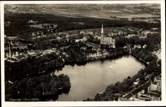 Ak Chemnitz in Sachsen, Panorama mit Schlossteich, Kirche, Luftbild