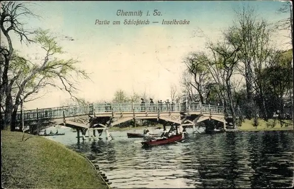 Ak Chemnitz in Sachsen, Partie am Schlossteich, Inselbrücke