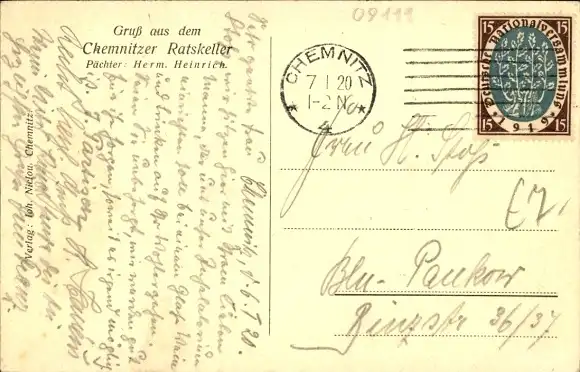 Zustand, siehe Scan, gelaufen, 1920- Pächter: Hermann Heinrich - ca 14 cm X 9 cm