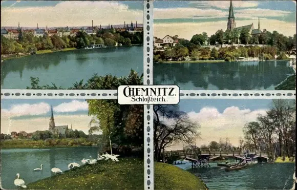 Ak Chemnitz in Sachsen, Schlossteich, Teilansicht, Brücke, Schwäne