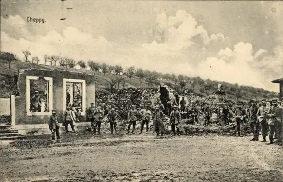 Ak Cheppy Meuse, zerstörte Häuser, Soldaten