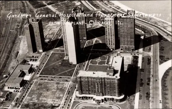 Ak Chicago Illinois USA, Gardiner General Hospital and Apartment Skyscrapers, Luftbild