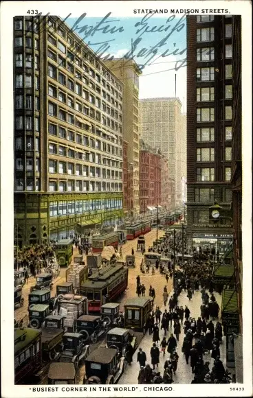 Ak Chicago Illinois USA, State and Madison Streets, Busiest Corner in the World, Verkehr