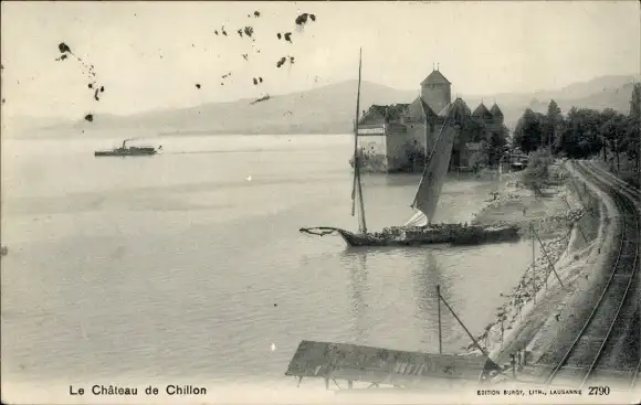 Ak Chillon Kt. Waadt, Schloss am Seeufer, Bahnstrecke