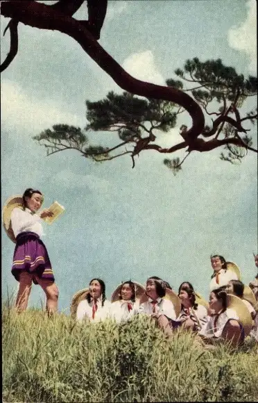 Ak China, Mädchen in Uniform auf Wiese, Vorleserin