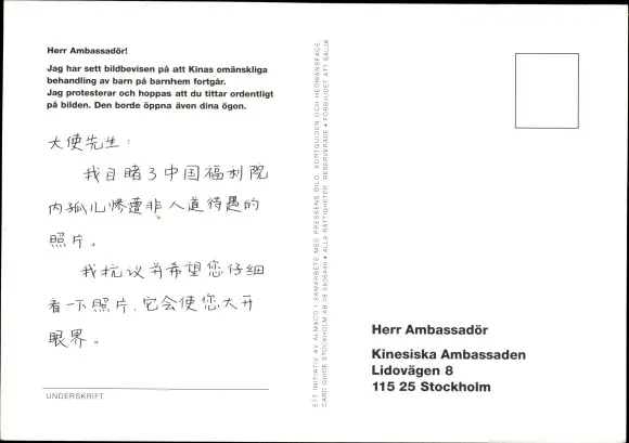 Ak China, Protest gegen die unmenschliche Behandlung von Kindern in Waisenhäusern