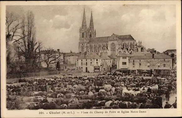 Ak Cholet Maine et Loire, Place du Champ de Foire et Eglise Notre Dame