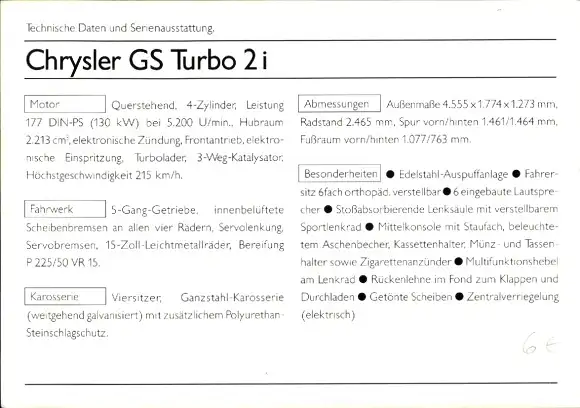 Ak Chrysler GS Turbo 2i, technische Daten, Serienausstattung