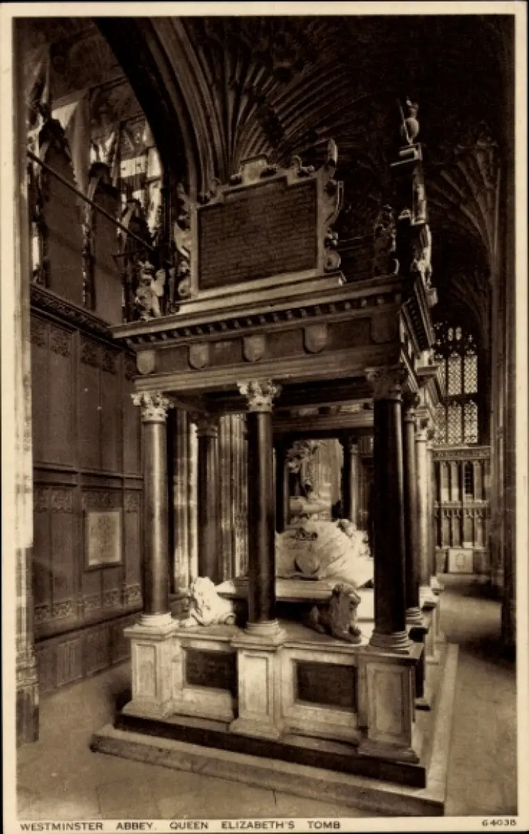 Ak City of Westminster London England, Queen Elizabeth's Tomb, Innenansicht, Grabmal, Säulen, Gra